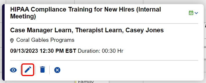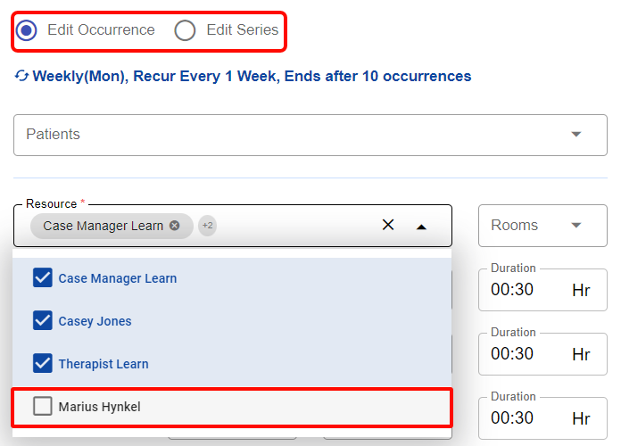 - Note: If a user has been added to an appointment with multiple other resources, that user can edit the appointment and even remove themselves from it. If the appointment is recurring, select the Edit Occurrence button to edit only the selected appointment and the Edit Series button to edit every single appointment in the series.