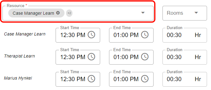 - If you are a Super Admin or have the Manage Schedules role enabled, you can add as many resources as you need to the appointment using the Resource drop-down. Otherwise, the Resource field will show your name by default and you will only be able to create non-patient appointments for yourself.