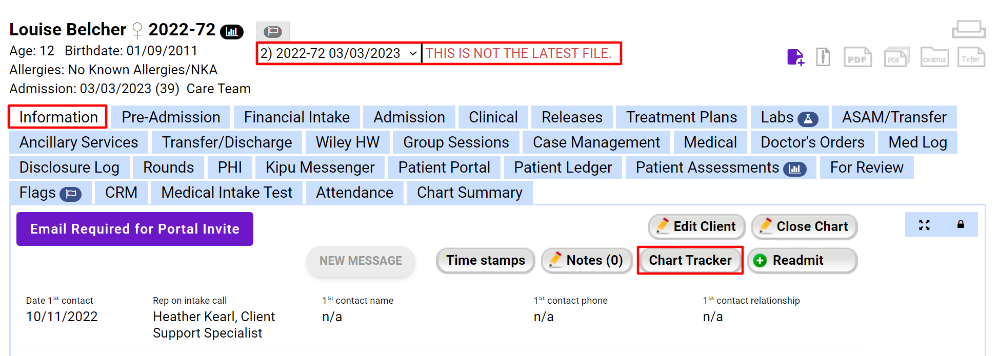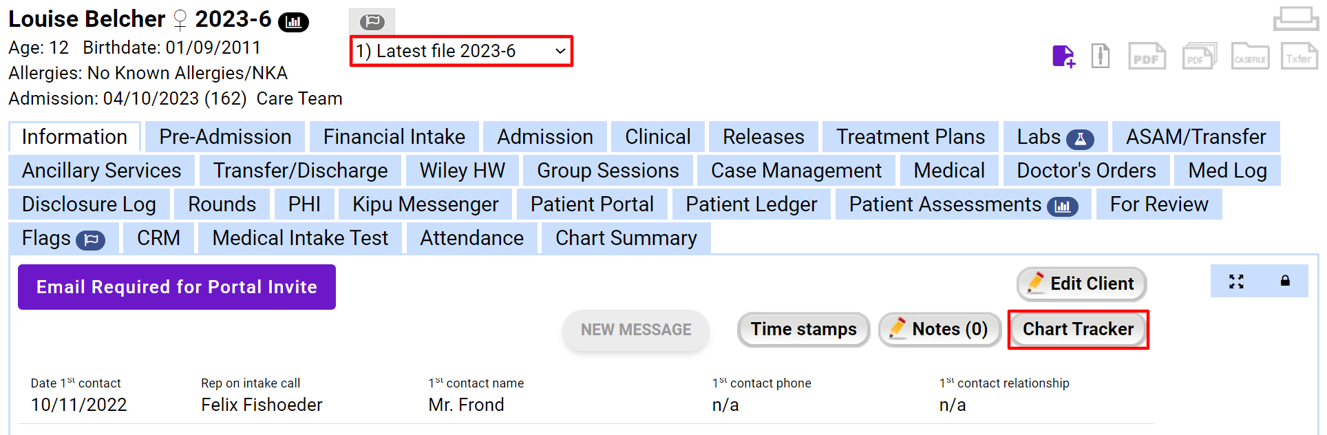 - On the Information tab/Facesheet of the patient's previous episode of care select the Chart Tracker button.