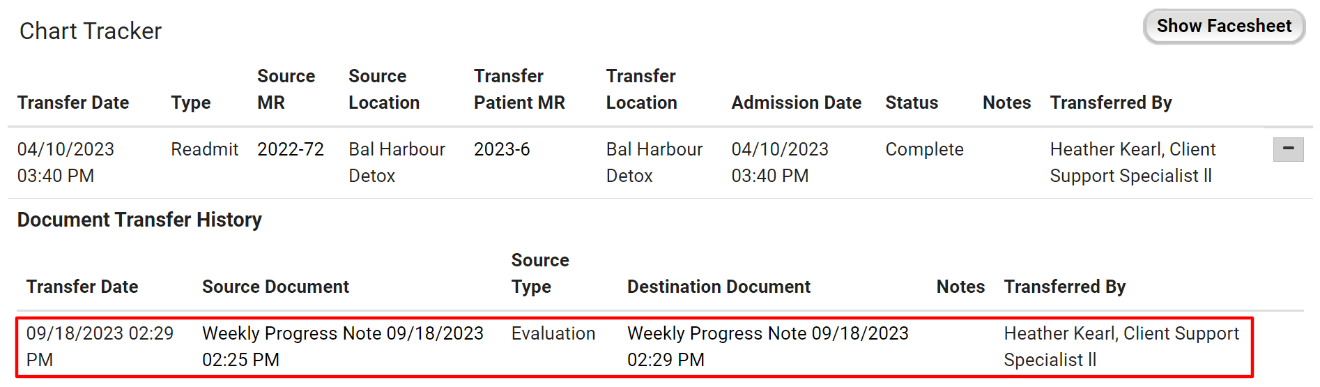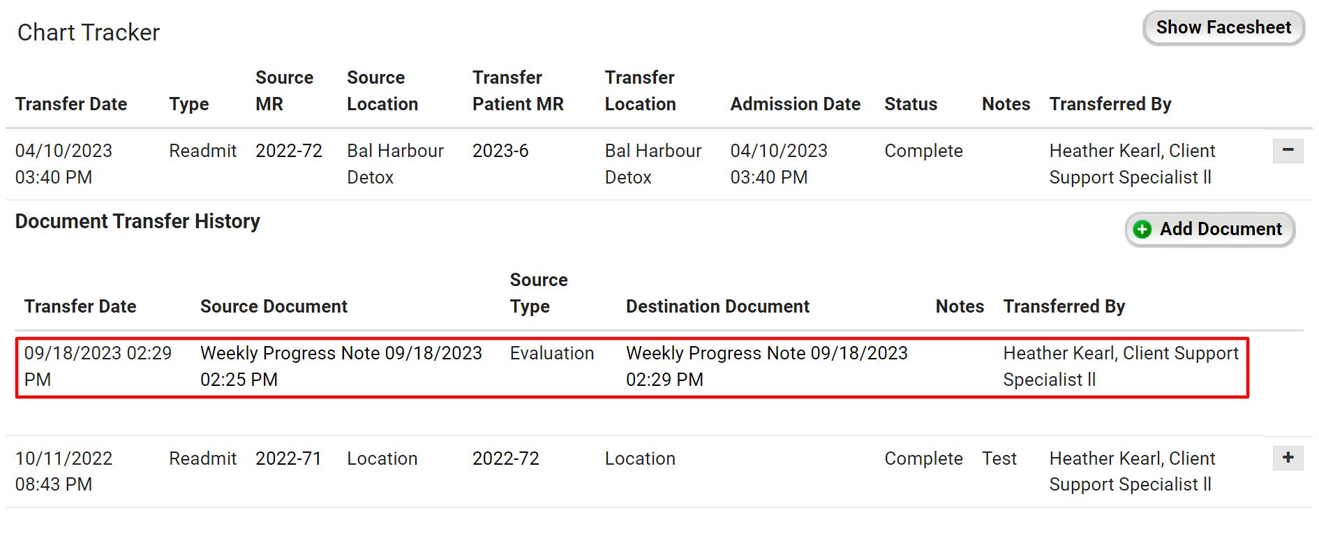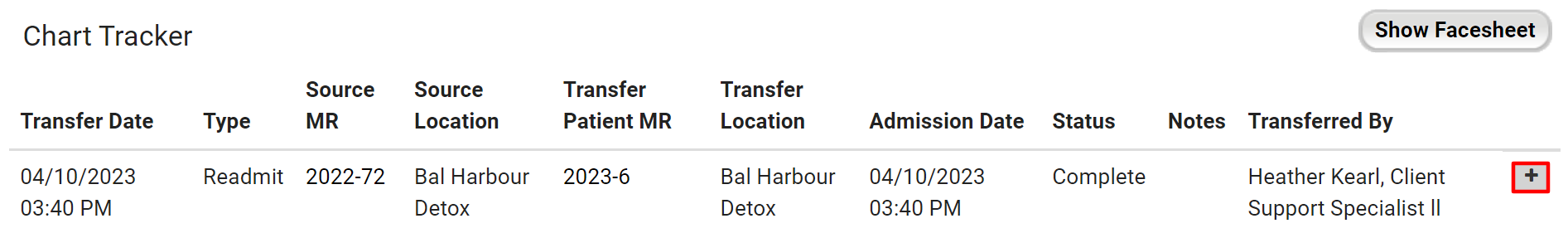 - On the Chart Tracker page, select the + next to the name of the person who transferred the patient to open the Document Transfer History.