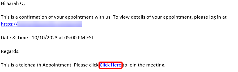 New Click Here hyperlink for Appointment Communication: We have changed the Zoom telehealth link sent out in text and email communications to show as a “Click Here” hyperlink instead of the Zoom string link.