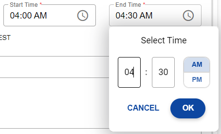 Start Time and End Time Selection Change: We have changed the way the start and end time selection occurs. Users will now type in the desired hour and minute times instead of selecting them by clicking on the clock.
