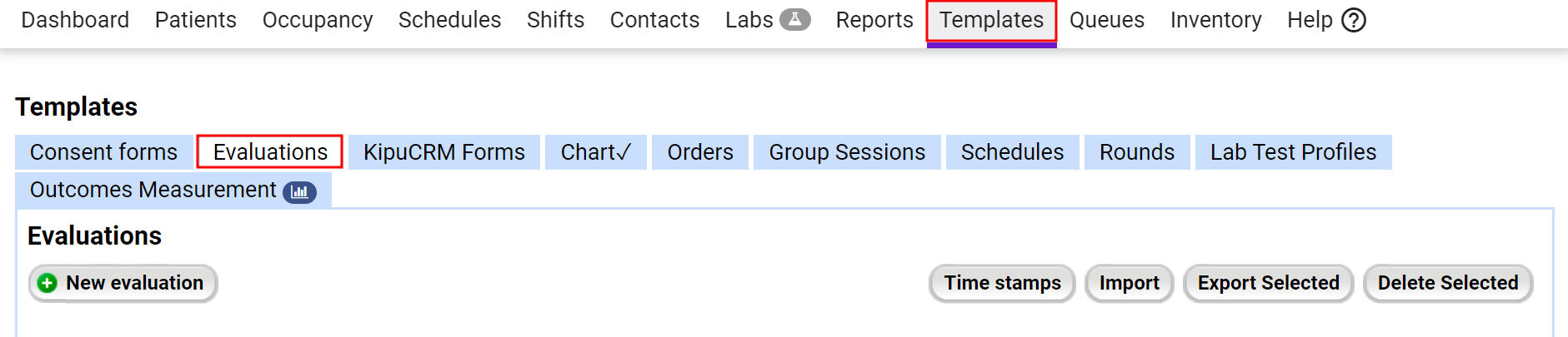 - Select the Templates tab and then the Evaluations tab.