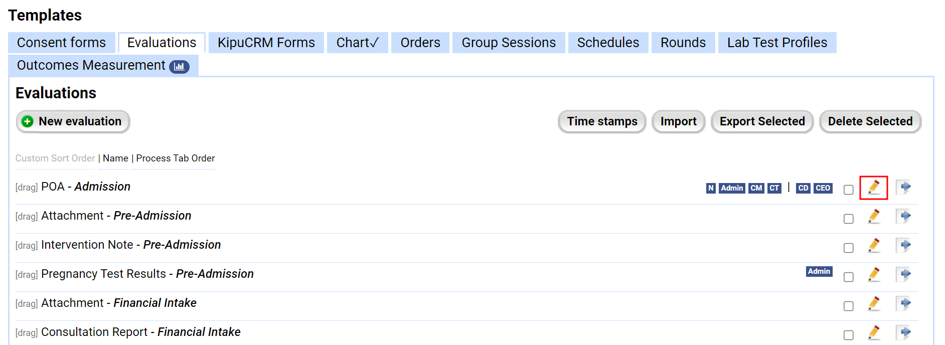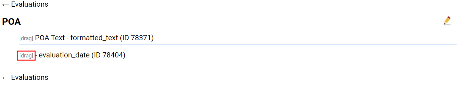 - The pencil icon brings you to a list of all available evaluation items. You can drag and drop these options to reorder them.