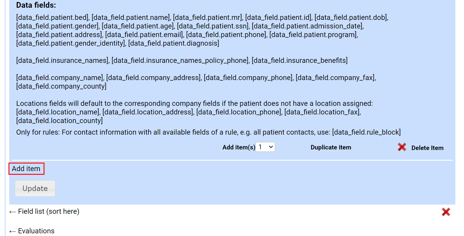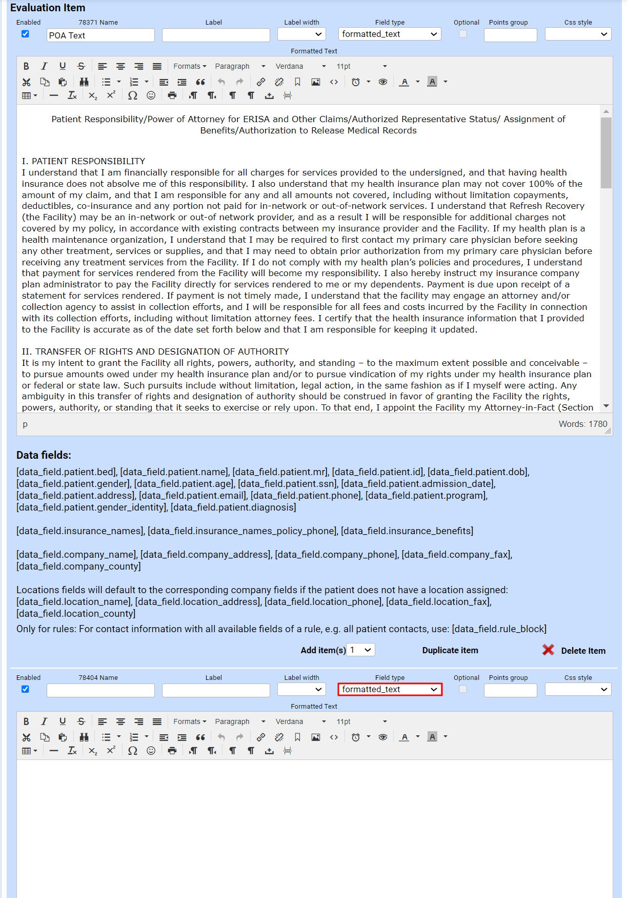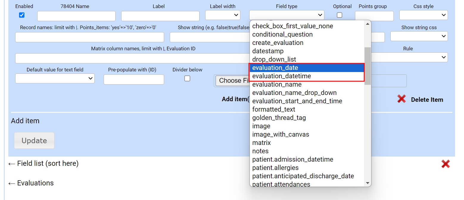 - Below the evaluation item with the field type formatted_text locate the Add item option and select it. A blank field type box will appear below the first one.
