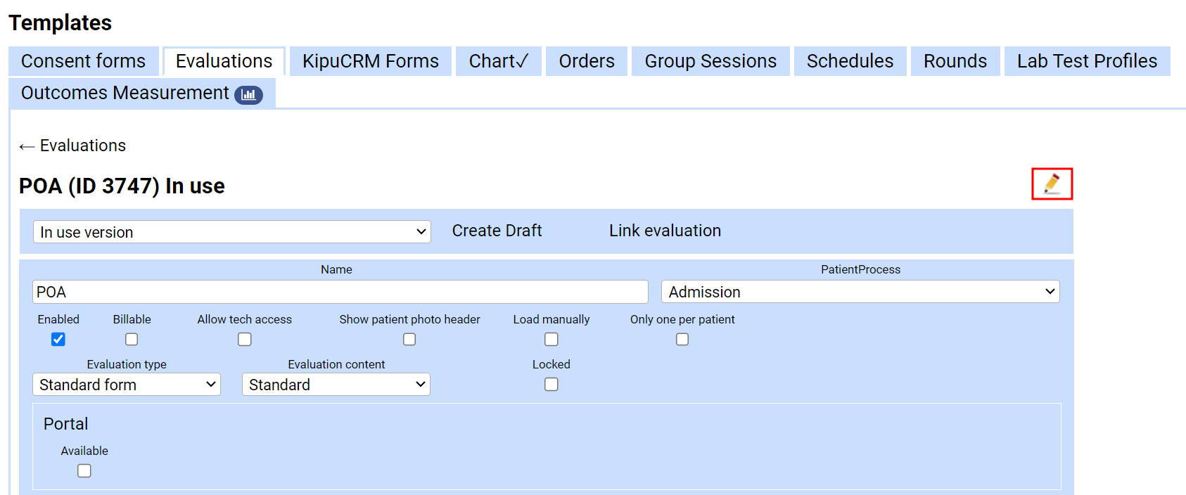 - Add the new evaluation item as the evaluation_date field type, scroll up to the top of the template and click the edit pencil to the far right.