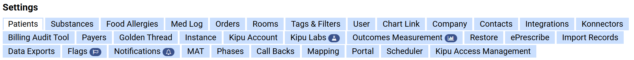 Some Settings tabs will only be available when enabled in your Instance Settings (like Outcome Measurements and Flags). Other tabs are only available based on system configuration set up by Kipu Staff like MAT or Labs tabs.