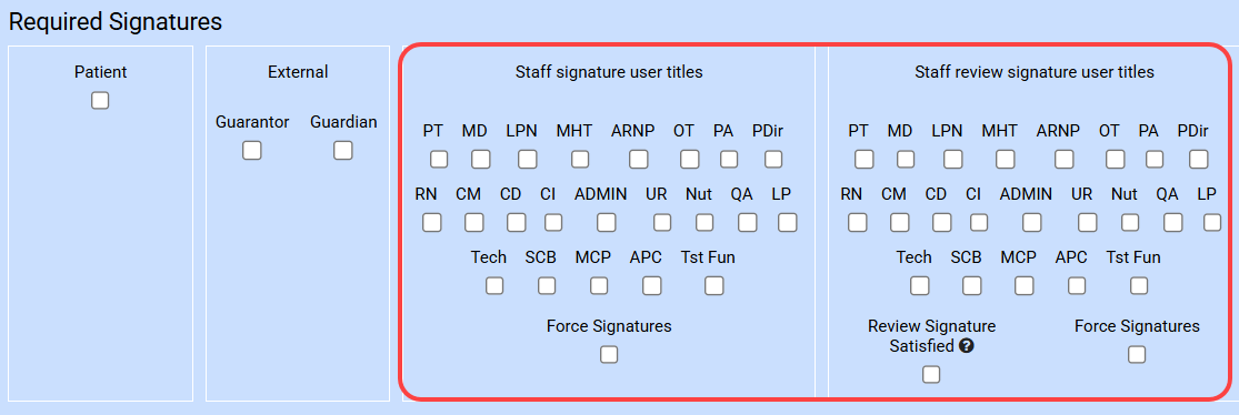 - The template must have at least one signature function selected under both the Staff signature user titles and Staff review signature user titles to move to the Ready for Review status.