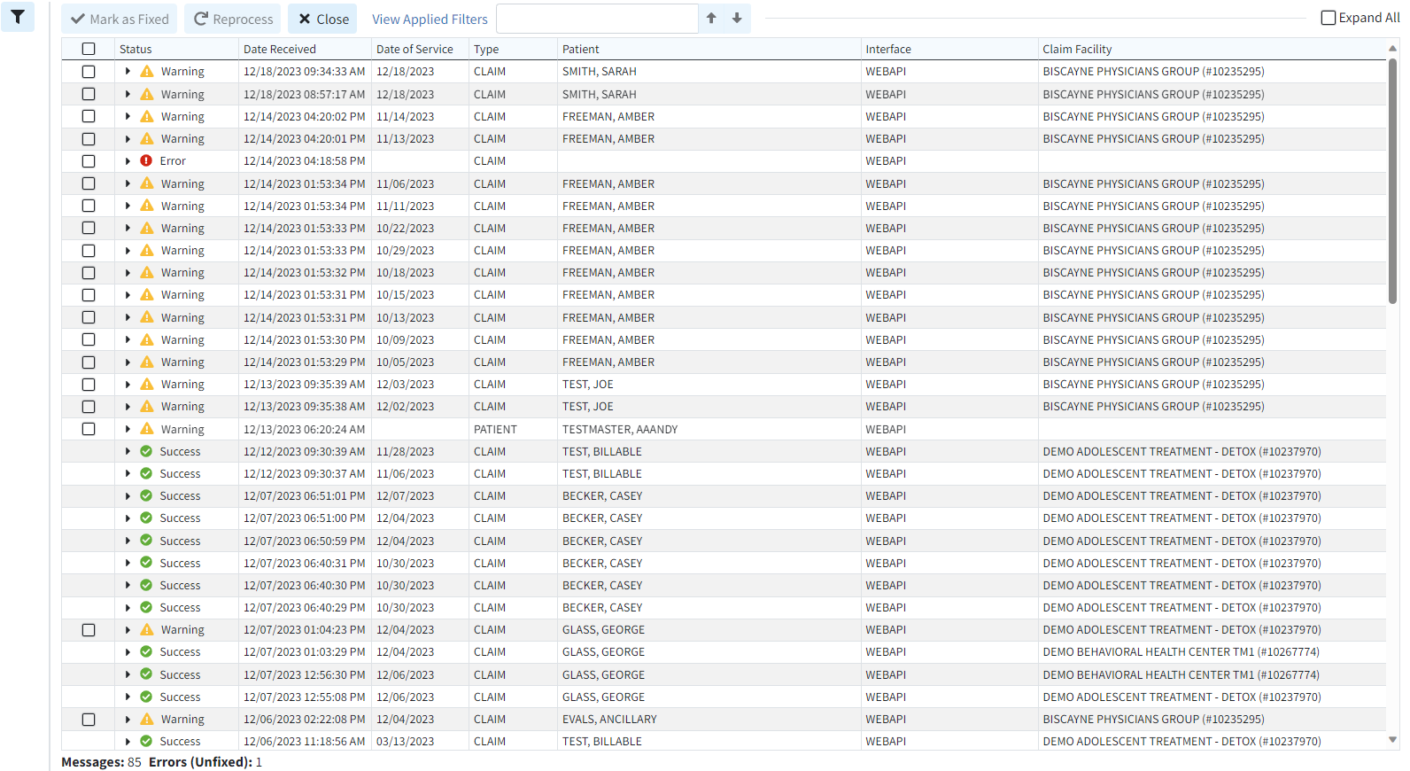 Interface Tracker empowers you to oversee and monitor all interface messages received from the Kipu EMR within CollaborateMD. Obtain insights into the reasons behind the failure of messages related to patient demographics and claims, learn corrective measures, and prevent recurrence.