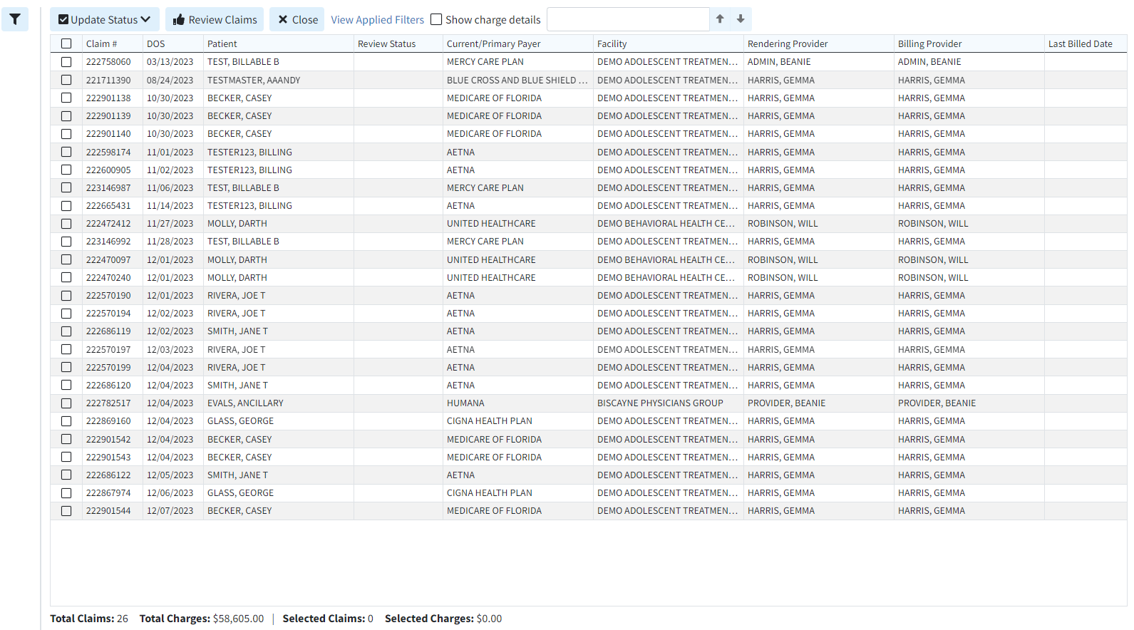 With Status Control, you can update the claim status or conduct a review for multiple claims simultaneously. When charges are transmitted from the Kipu EMR to CollaborateMD, they enter a status of Waiting for Review or Incomplete.
