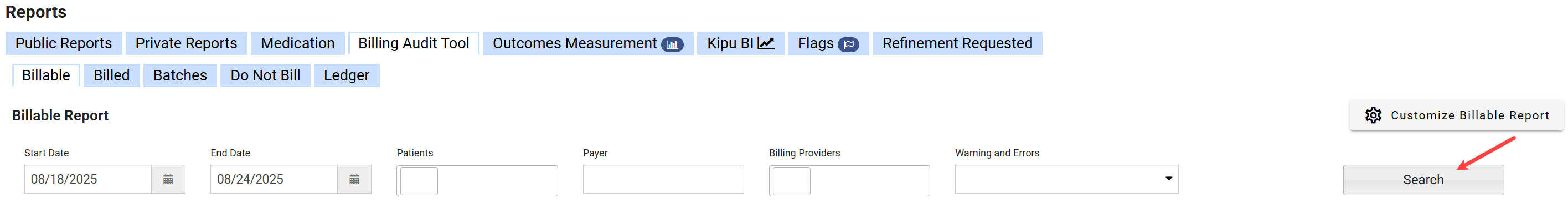 - Set your date range. You can also search for specific Patients/Clients, Payers, or Rendering Providers. Click Search.