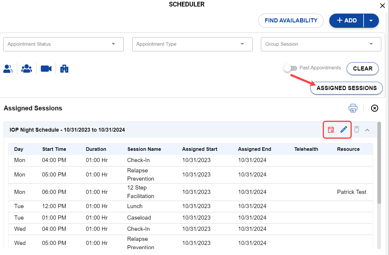 - Drop and edit group session schedules and ad hoc sessions with fewer clicks: With the newly added Assigned Sessions link on the patient chart, users can view, edit, and drop group session schedules and ad hoc sessions with just a few clicks. This option will save time and confusion as we separate each schedule and ad hoc session into a new view on the patient chart. For more information, check out this article.