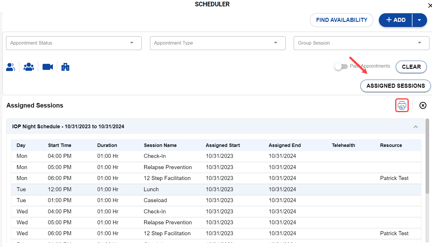 Group session schedules viewable from the patient chart by non-Scheduler users: The new Assigned Sessions button on the patient chart view of Scheduler will allow the user to see all the assigned Group Session Schedules and/or Ad Hoc Group Sessions. They will also be able to print the Group Sessions assigned.