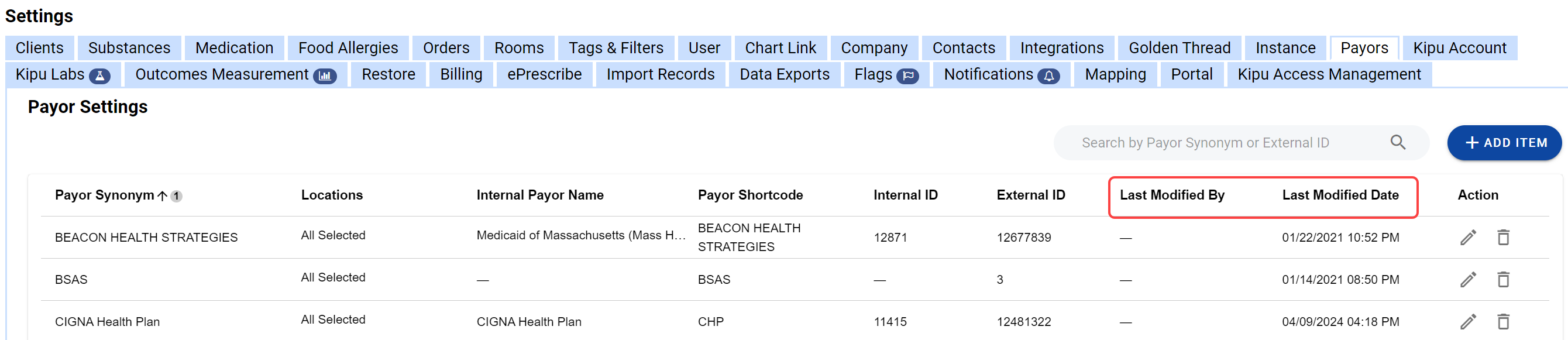 Billing: The Payor Settings configuration now will record the name of the last person who made an edit to a specific row together with the edit's date and time. Click here for more information on adding and editing payors.