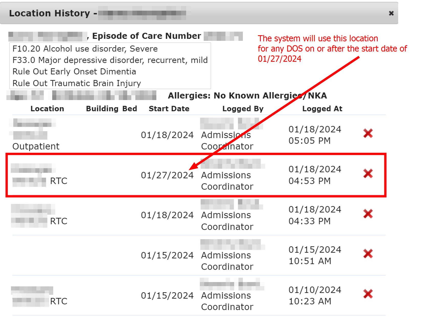 The system assigns the location to the Date of Service (DOS) based on the Start Date. In this scenario, for any DOS on or after 01/27/2024, the system will use the assigned RTC location.