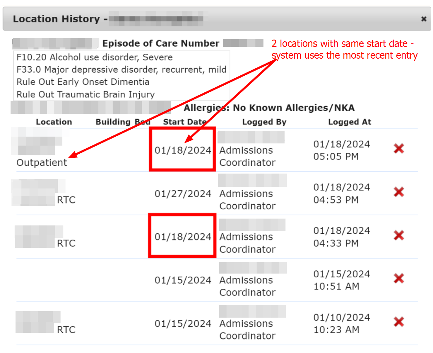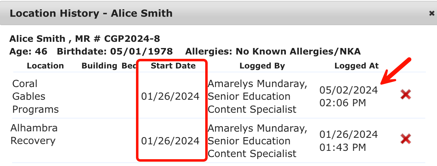 If two locations are entered with the same start date, the system will apply the most recent entry for the location in the billing report. In this scenario, the system would choose the Outpatient Location because it was logged at 5:05 pm, whereas the RTC location was logged earlier at 4:53 pm.