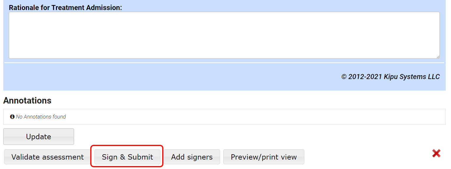 - If the patient is at the facility, complete the assessment, and click the Sign & Submit button.