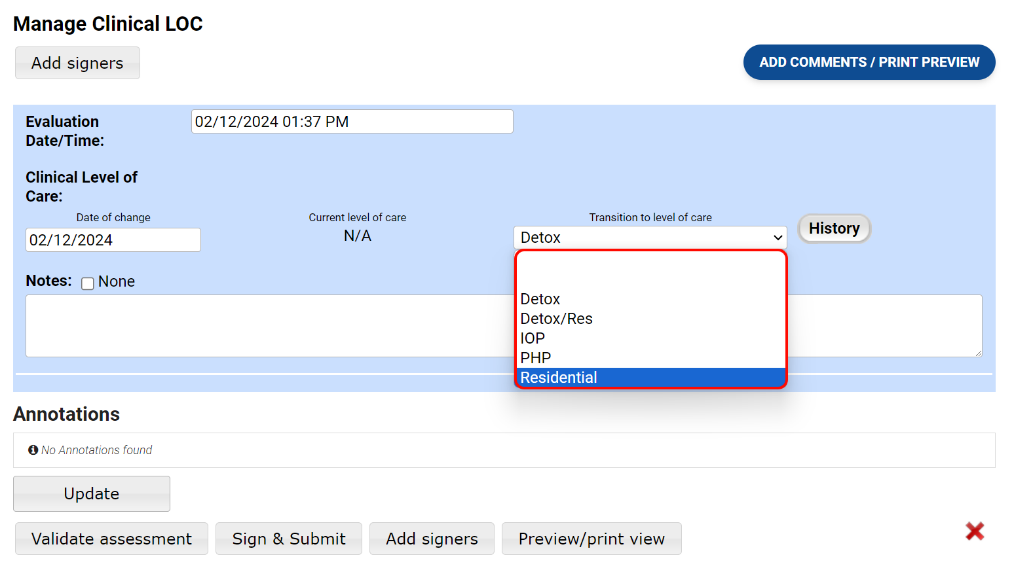 - Note: Super Admins can customize the available level of care options under Settings > Patients. For more information on configuring clinical levels of care, click here.