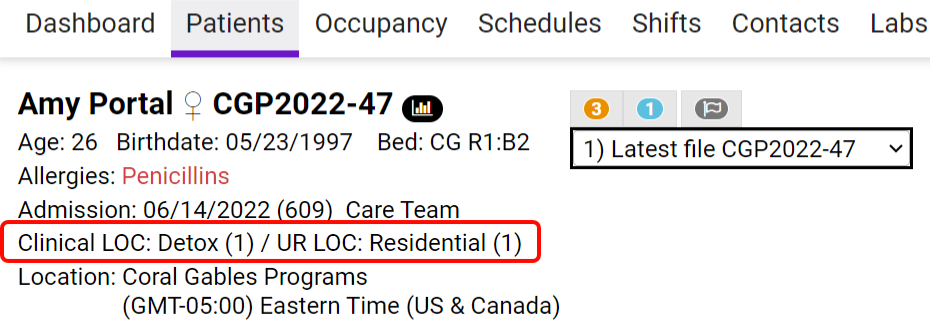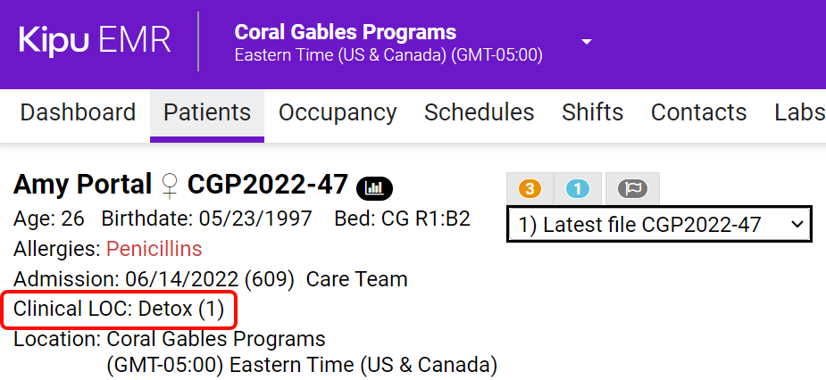 - The system will display the Clinical LOC on the top left of the patient’s chart.