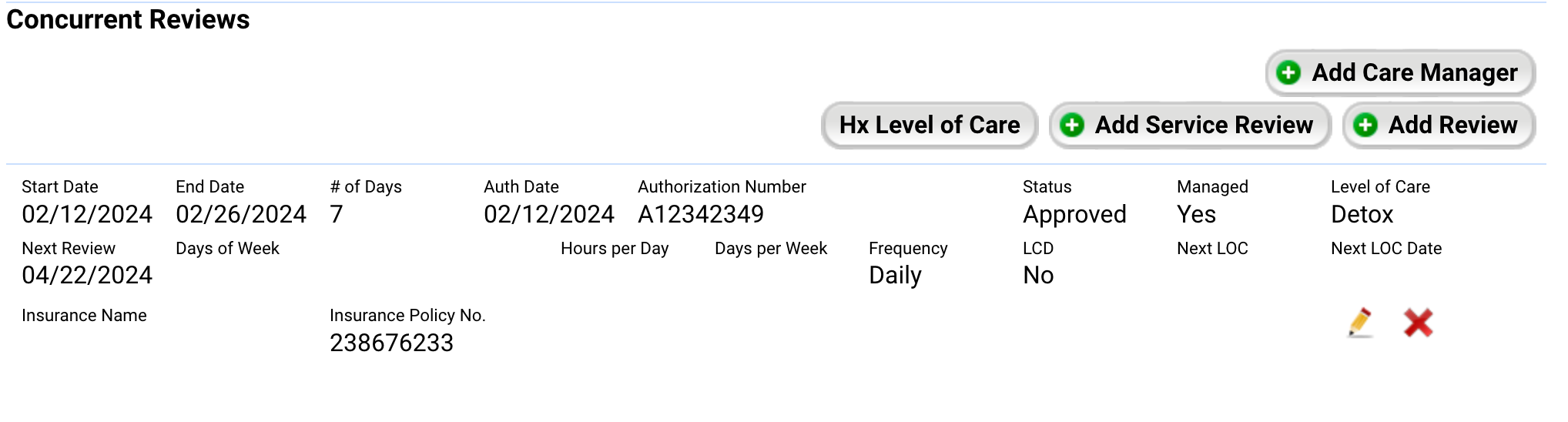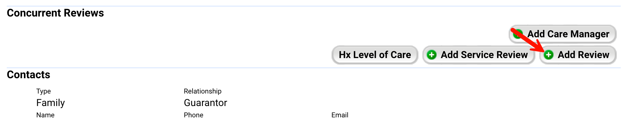 - Next, assign a UR Level of Care to the patient by clicking on + Add Review to complete an insurance authorization in the facesheet. For more information on adding UR LOC, click here.