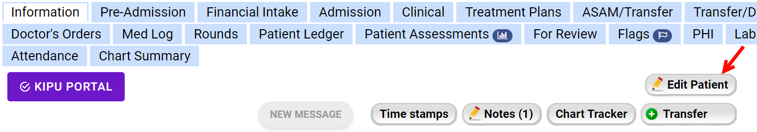 - Next, assign the patient a building, room, and bed. Open the patient's chart, and from the Information tab, click the Edit Patient button.