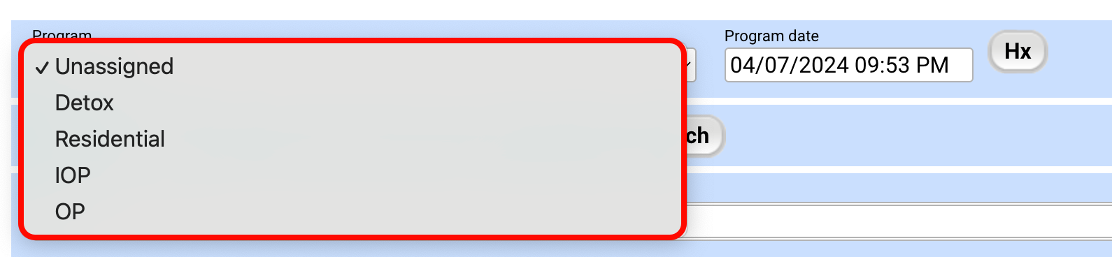 - Select the desired program from the drop-down menu options. Once a patient is assigned to a program, the information appears on the landing page, occupancy view, and bed board.