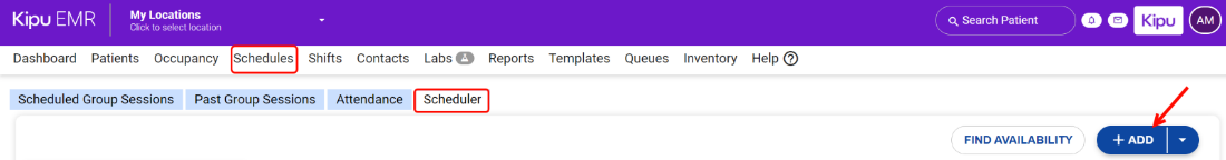 - Click the Schedules tab, and then the Scheduler tab. Click on the + Add button to schedule the appointment.