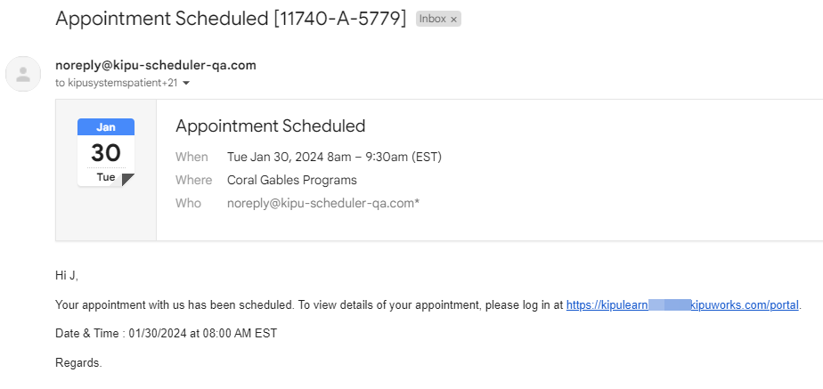 - The patient will receive a notification by email or text that the appointment has been scheduled (depending on how you have set up the appointment communications). Click here to learn more about appointment communications.