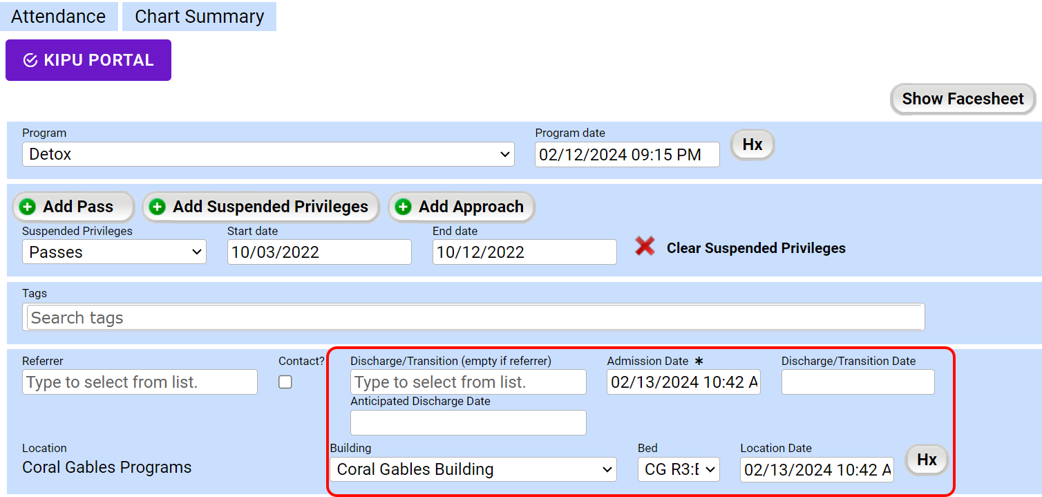 - Add the Admission Date, Building, Bed, and Location Date based on availability.