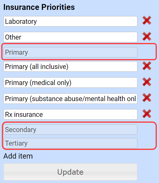 Billing: The Insurance Priority values Primary, Secondary, and Tertiary can no longer be deleted from the system to maintain data integrity for integrated billing customers and ensure that insurance is automatically mapped correctly. For more information, click here.