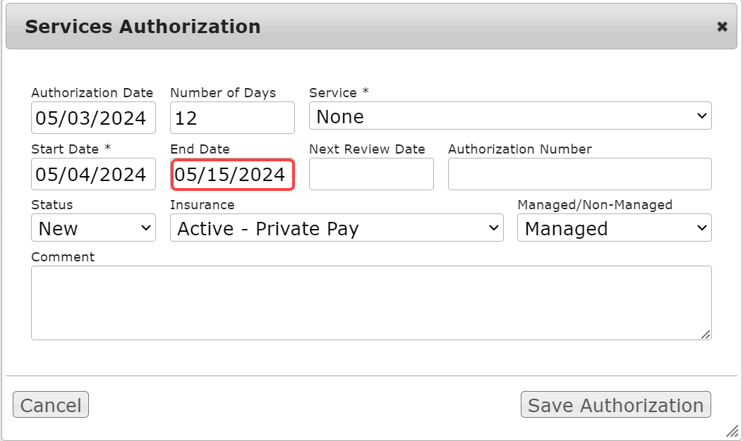 - Billing: Rolled out automatic end date calculation to the Service Review pop-up window previously implemented in the Auth Review pop-up window to improve charting efficiency for the UR team. For more information, check out this article.
