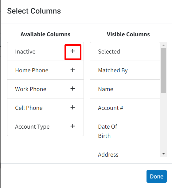 - From the displayed options, click the + sign next to the columns you want to include in your view.