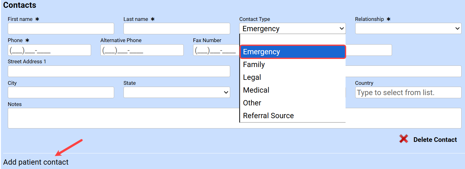 - Click on Add Patient Contact and make sure to collect an emergency contact type.