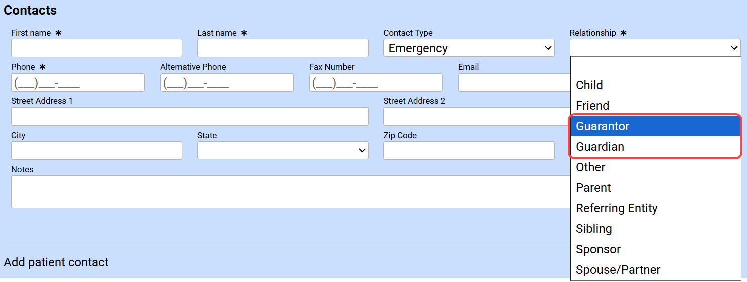 - Add patient guarantor, guardian, or additional contacts (if applicable).