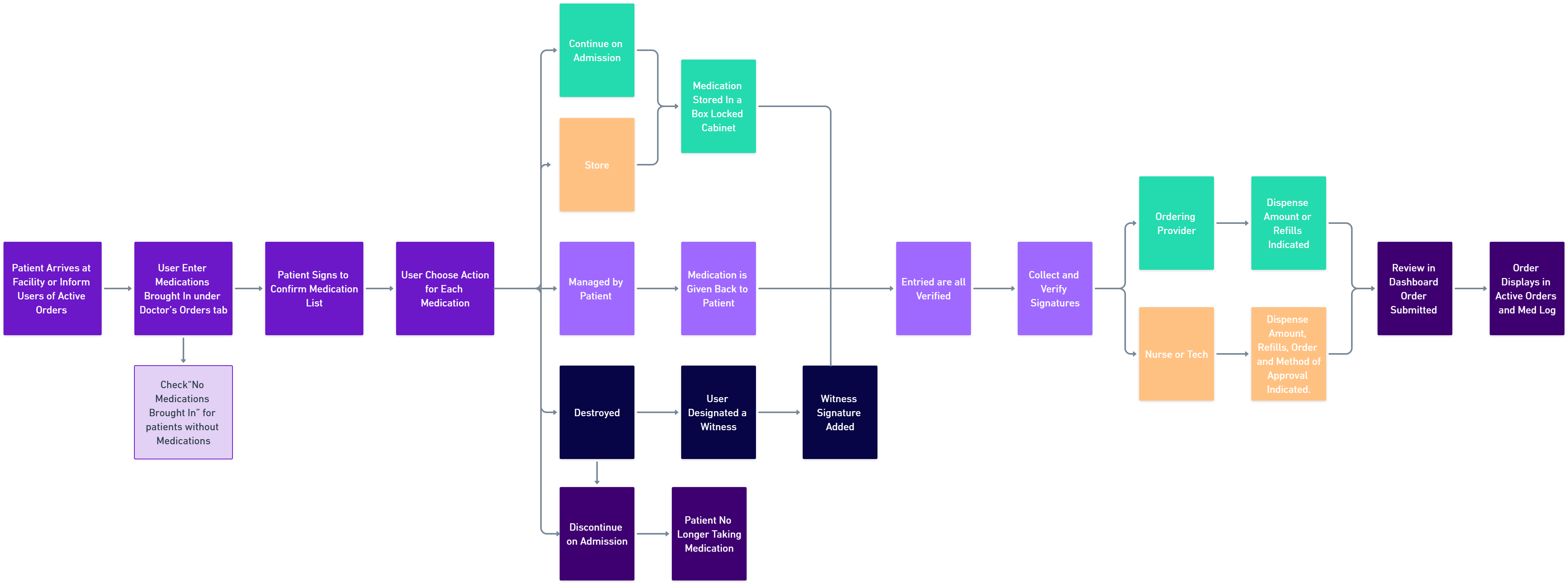 - Note: Most facilities will have a user complete this process while a patient is resting. In this scenario, the dashboard will show when patient signatures must be collected for Meds Brought In. This step will not restrict the user from continuing.