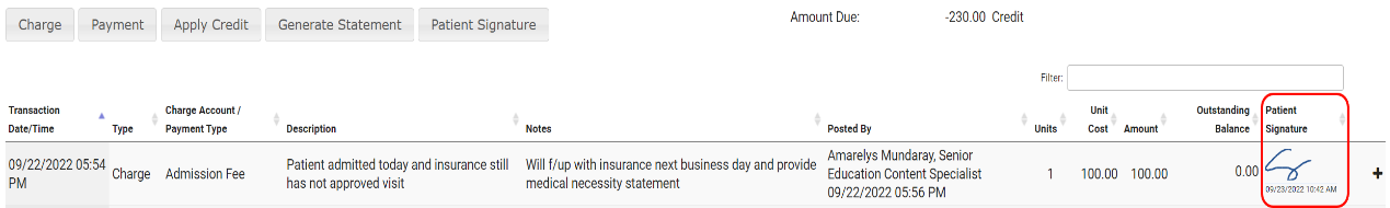 The Patient Ledger records all deposits and withdrawals made by the patient during their treatment episode. Users can process payments, create charges, apply credits, generate statements, and collect signatures directly from the Patient Chart using the Patient Ledger. You can also collect pharmacy co-payments, admission fees, or payments for supplemental treatment resources like books or audiotapes. The patient’s total amount due or any credit on the patient’s account is also visible on the ledger.