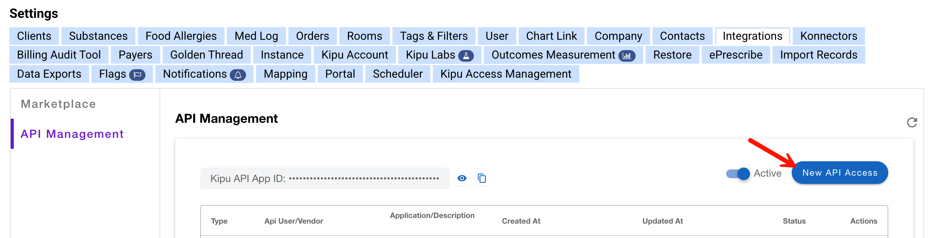 - From the API Management screen, click New API Access.