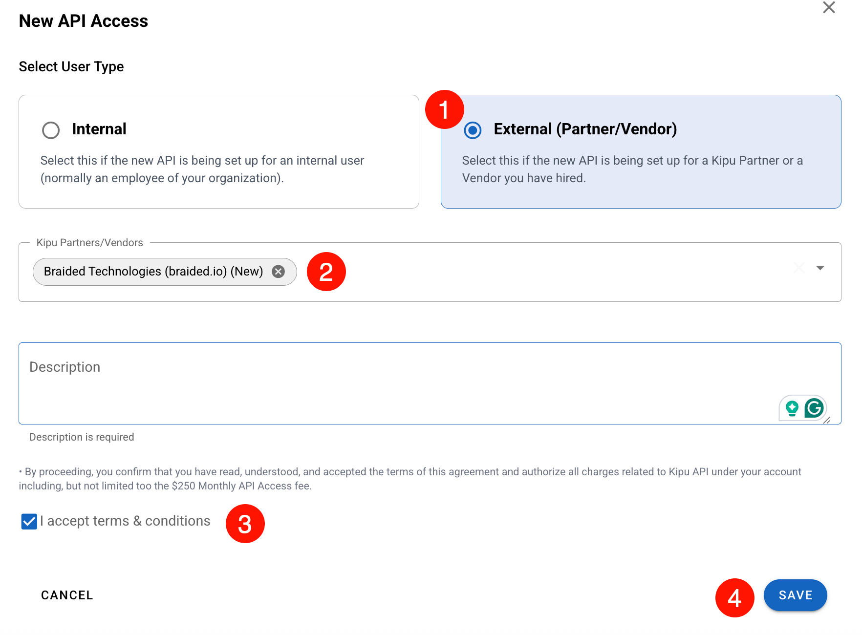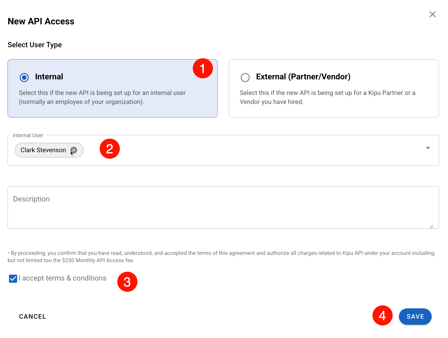 Note: The selected user will be the owner of the API credentials and is responsible for managing the connection. They will receive their credentials via encrypted email. You must still provide them with your App ID.