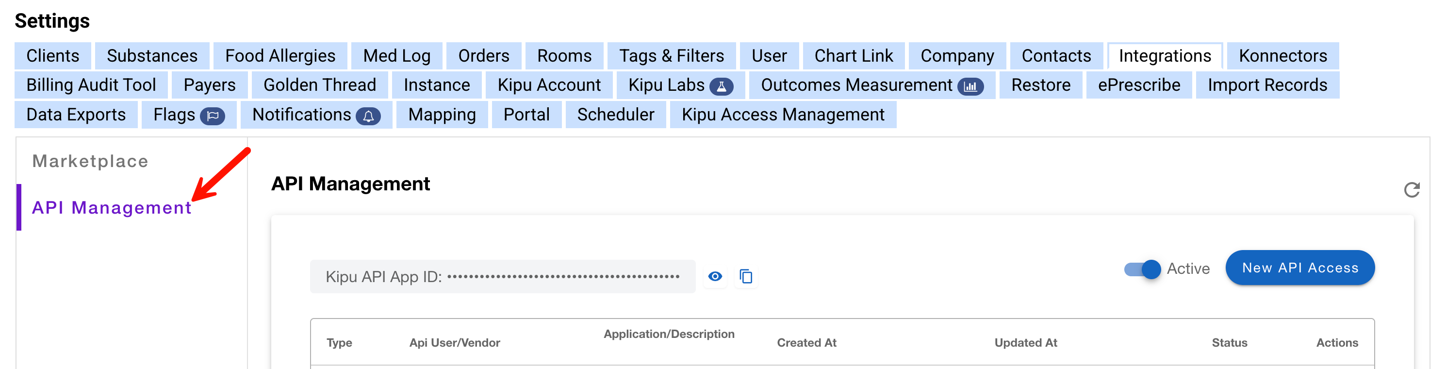 Before adding or managing API connections, you'll need to access the API Management tool within your Kipu EMR system. This area allows authorized users to configure integration points securely. Please note that APIs incur a related fee.
