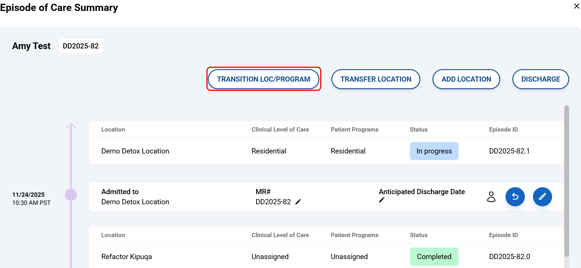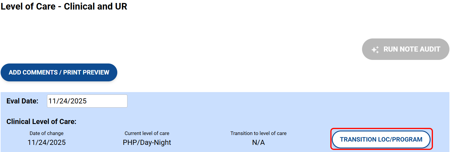 - Click the Transition LOC/Program button in the Episode of Care Summary window.