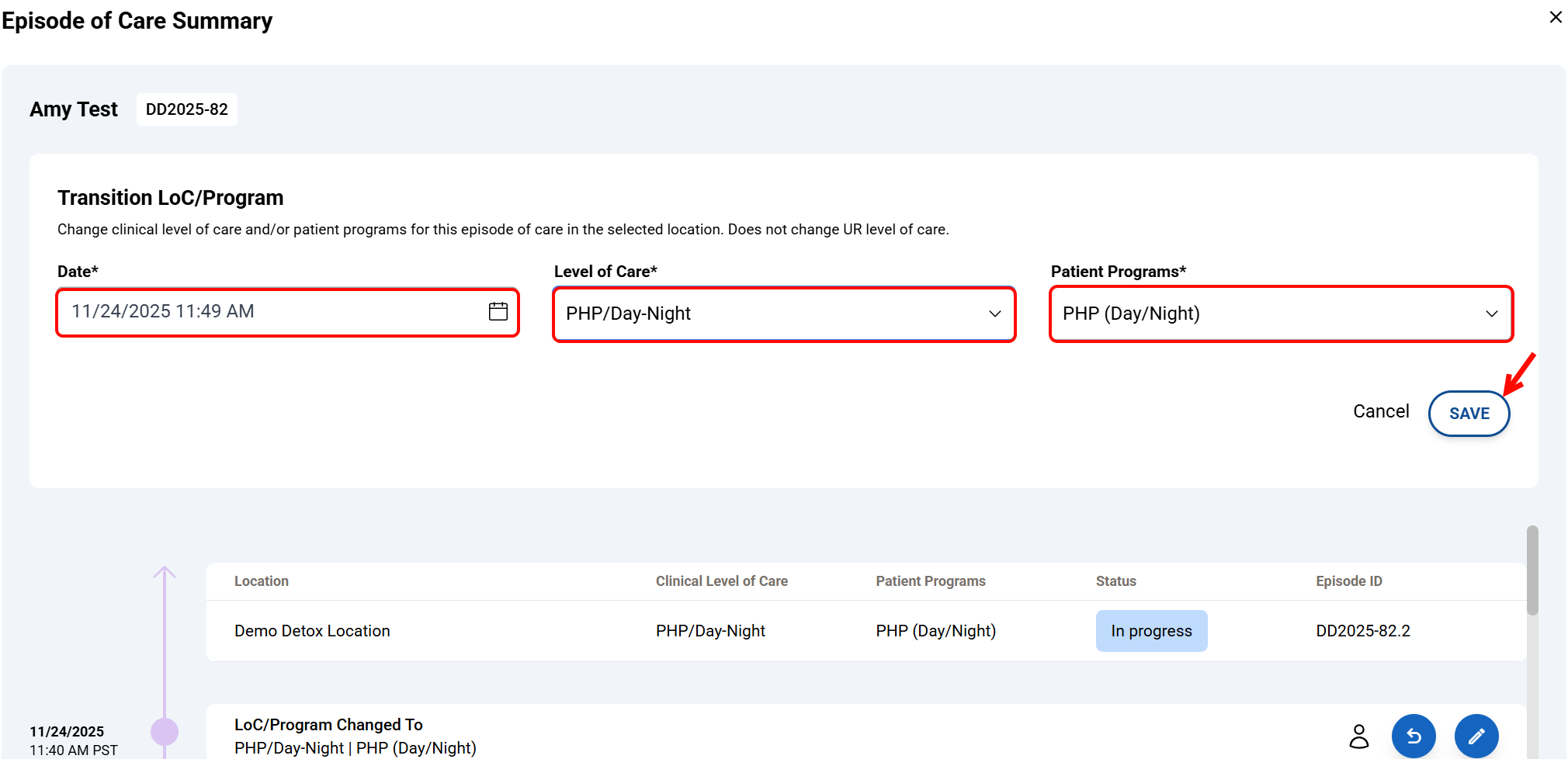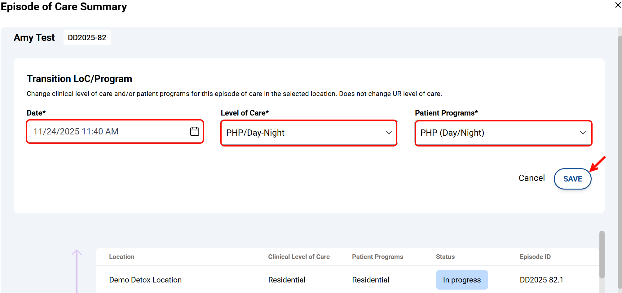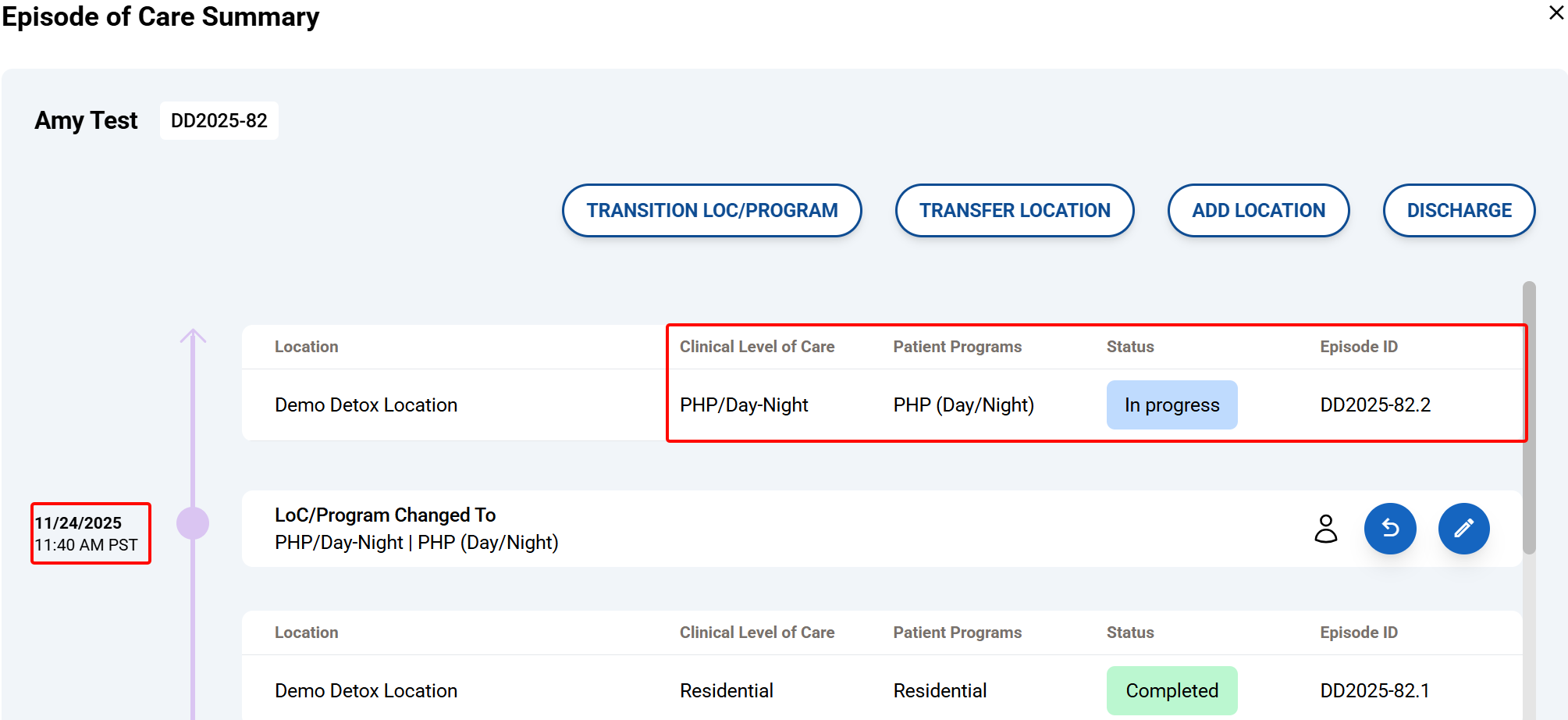 The Treatment Episodes feature introduces a workflow to transition the patient’s Clinical Level of Care or Program. This workflow also allows users to tracks patient transitions between different levels of care or programs.