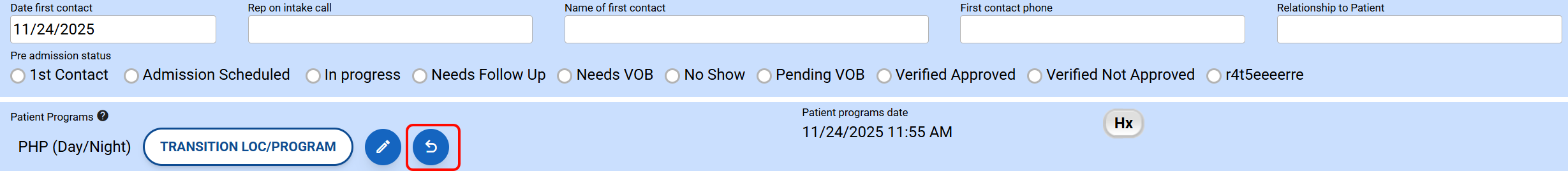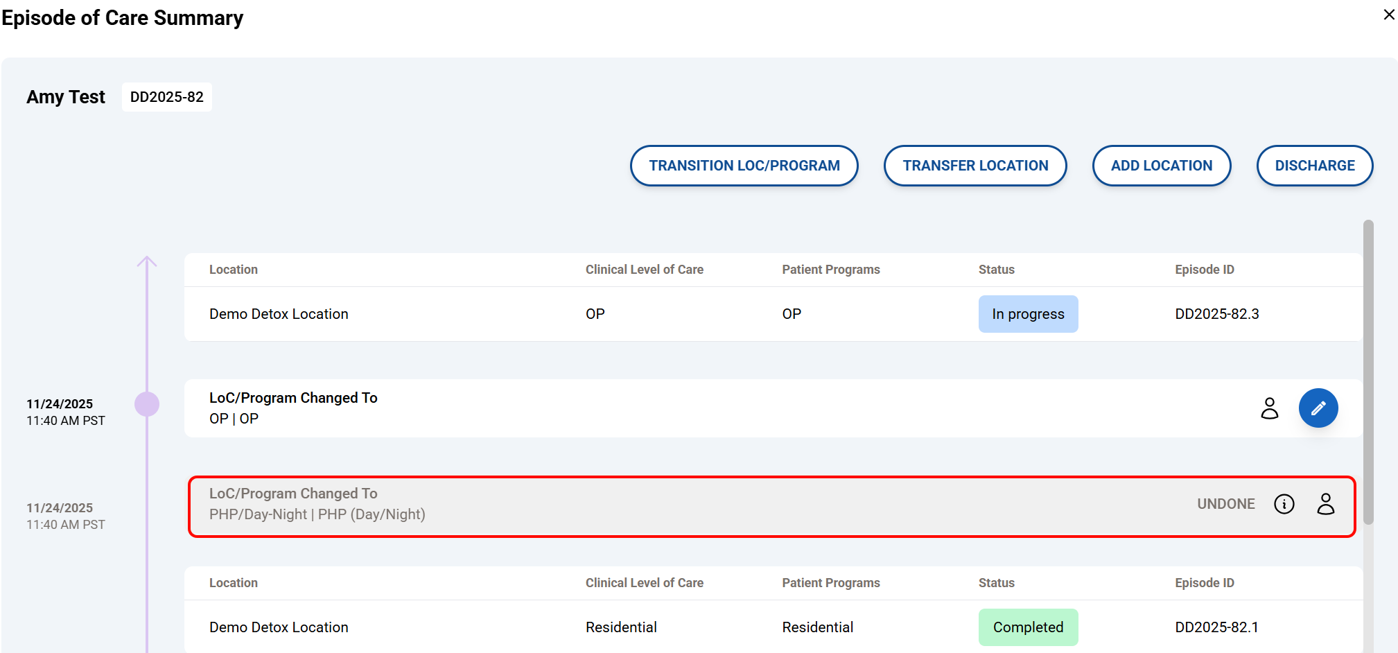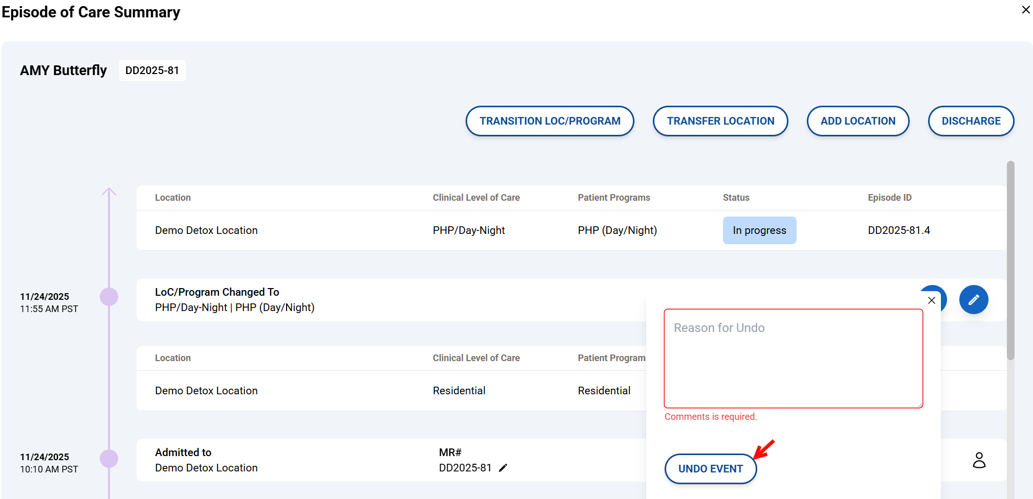 Use Undo when the entire event needs to be removed. Example: If you transitioned the patient to the incorrect level of care, the transition event should be removed entirely. Undo is only available when the transition is the most recent event, and no documentation is attached to that episode.