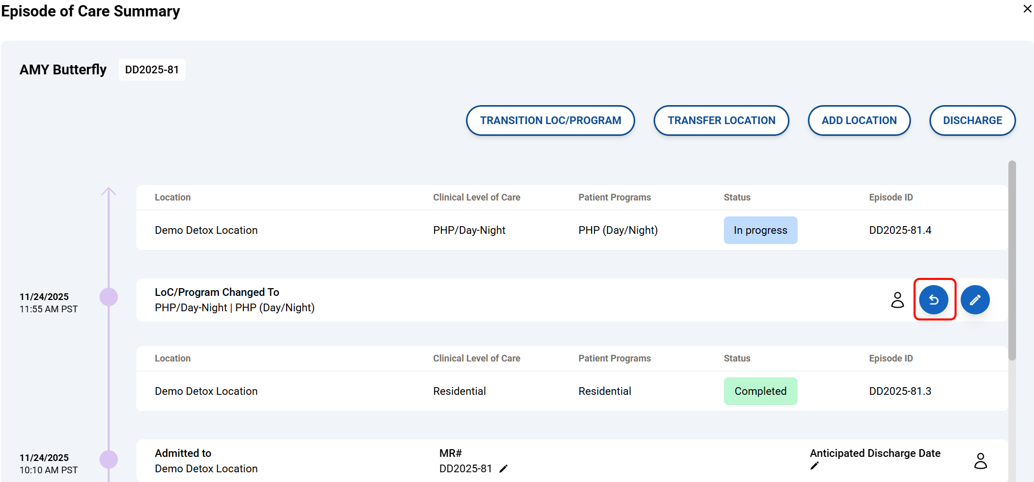 Alternatively, open the Episode of Care Summary and click the Undo icon next to the Staff icon to remove the entire transition event.