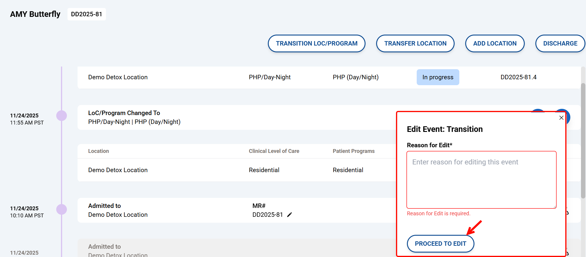 - In the Edit Event Transition window, enter the reason for the edit and click the Proceed to Edit.
