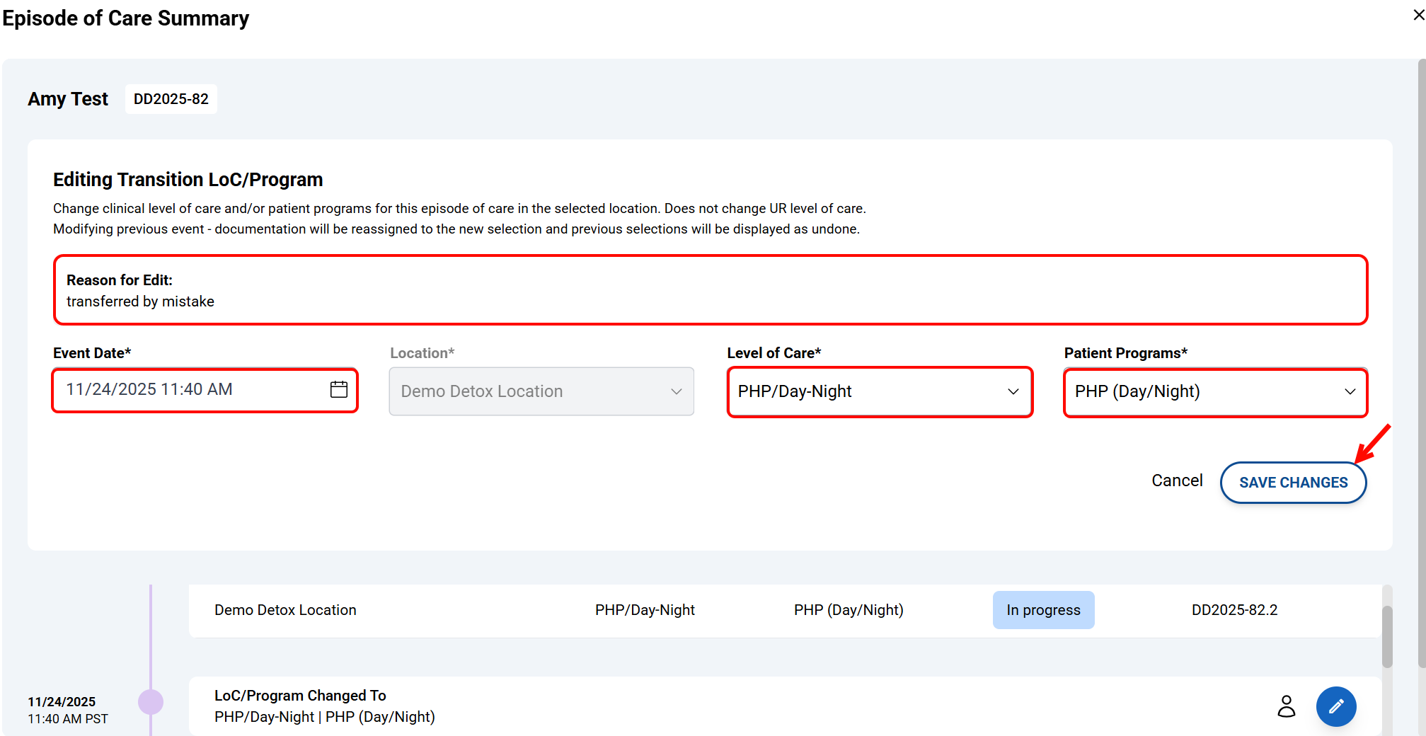 - The system displays an Editing Transition LOC/Program notice. The documentation will be reassigned to your new selection. Update the Transition Date, Level of Care, or Program, then click Save Changes.