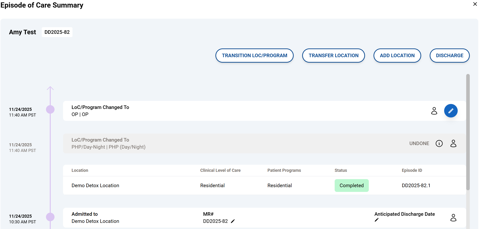 - Open the Episode of Care Summary and click the pencil icon next to the Undo icon to modify the transition event.