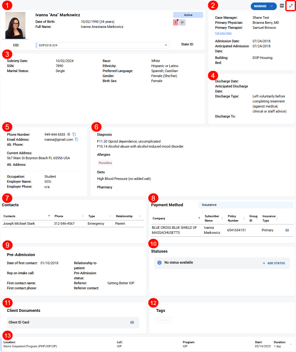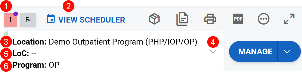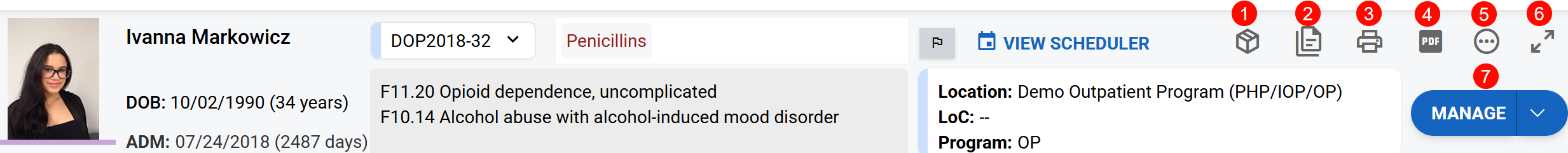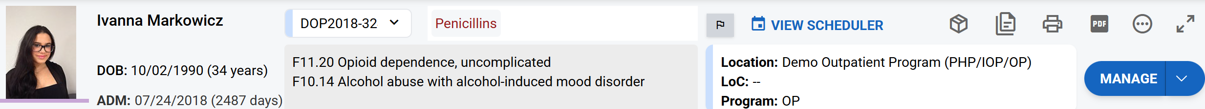Manage: Opens the Episode of Care Summary window. The Episode of Care Summary is a timeline that tracks the patient’s journey through treatment, from creation to discharge. It helps monitor and understand the patient's progress, showing changes in location, level of care, and programs.