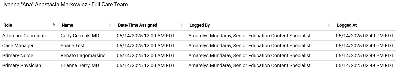 Full Care Team: Click the link to view the Full Care Team assigned to the patient. This screen can be printed.