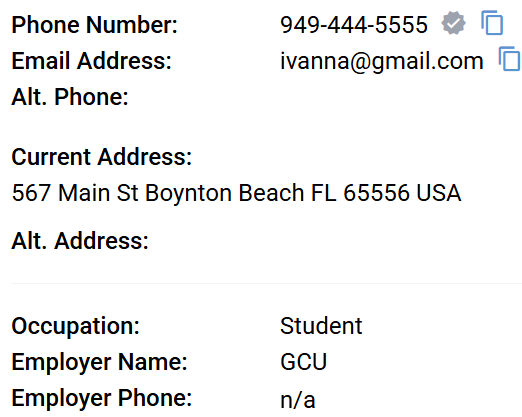 This section contains the patient’s contact and employment information. The checkmark icon indicates the patient’s preferred contact method. The copy icons allow you to copy the information.