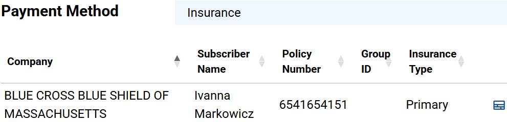 Insurance Card Icon: Click on the icon to view the front and back of the insurance card. This screen can be printed.
